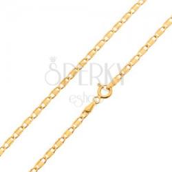 A sárga 14K arany nyaklánc lapos, ovális szemekből tevődik össze, amelyeket középen sima, fényes téglalap, az oldalakon pedig bemetszések és kivágások díszítenek. Delfinkapcsos zárszerkezet. Lánc szélessége: 2,6 mmLánc hossza: 450 mm (+/- 5 %)Zárószem szélessége: 2,1 mmLánc súlya: 3,1 gFémjelzéssel ellátott.