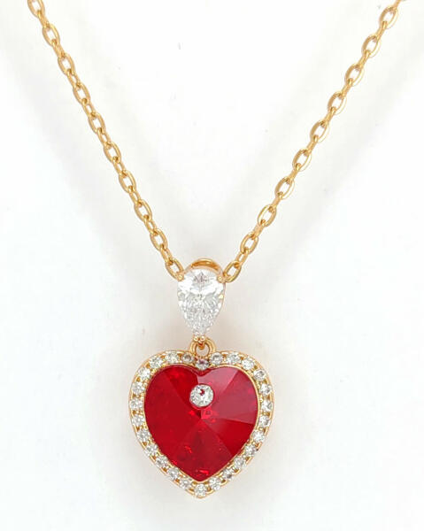 Aranyszínű nemesacél ( 316L ) nyaklánc, melyet bordó Swarorvski kristállyal díszített szív medál és sok apró fehér kristály tesz csillogóvá. A kristályok karmos foglalatban helyezkednek el. Időtálló ékszer, nem feketedik, nem színezi a bőrt . Mindennapi használatra is tökéletes választás. Antiallergén ékszer. 18K arany színben kapható. Nyaklánc hossza: 44 cm + 5 cm