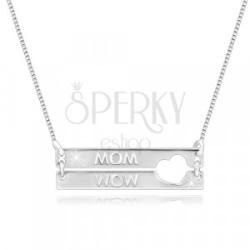 A 925 ezüst nyaklánc egy finom láncból és egy medálból áll. A láncot egymásra merőlegesen összekapcsolt, üreges kocka alakú szemek alkotják. A medál két lapos téglalapból áll, amelyeket egy kicsi gyűrű tart össze. A téglalap alakú táblákat a finoman gravírozott "MOM" - "ANYU" felirat díszíti, ugyanakkor az egyiken a felirat türkörképe látható. A feliratot dekorat