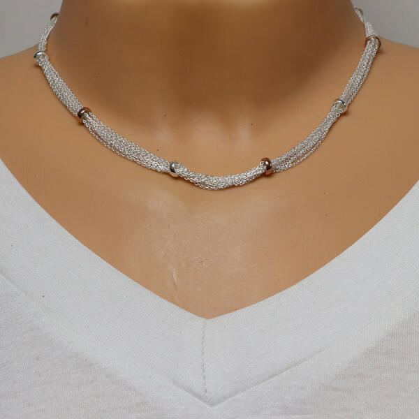 925 ezüstből készült nyaklánc, több lánc alkotja, amelyeket egyenletes távolságban, ezüst és rózsaarany lapított gyöngyök kapcsolnak össze. A nyaklánc hossza állítható és homárkarmos zárral rendelkezik. Egy lánc szélesség: 1 mmNyaklánc szélessége: 3 mmNyaklánc súlya: 17,6 gNyaklánc hossza: 420 mm (+/- 5%)Hosszabbító lánc: 30 mm (+/- 5%)Teljes hossza meghosszabbí