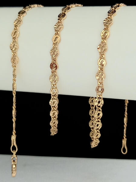 Aranyszínű, metszett mintás és lapított csiga szemek váltakozásával készített nyaklánc. A nyaklánc mindkét oldala mintás. Időtálló ékszer, nem feketedik víz hatására sem. Antiallergén ékszer. 18K arany színben kapható. Nyaklánc szélessége:4mm. Az antiallergén ékszerek olyan fémötvözetből készülnek, melyek nem irritálják a bőrt, nem okoznak allergiás reakció