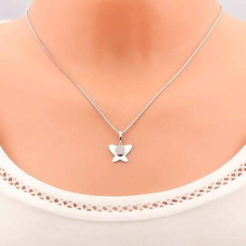 925 ezüst nyakék, amely egy vékony nyakláncból áll ovális szemekkel és egy pillangó alakú medálból, ami felülete lapos és tükörfényes. A pillangó medálon kívül a láncon található egy külön felfűzött karika, amely cirkóniákkal van kirakva. A nyaklánc hossza állítható, delfinkapoccsal ellátott. Medál mérete: 15 x 13 mmMedál súlya: 1,6 gNyaklánc szélessége: 1