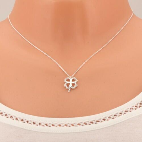 925 ezüst nyakék, egymásra merőlegesen kapcsolt ovális szemekből álló finom láncból és négylevelű lóhere medállal. A leveleket kristálytiszta ragyogó kerek cirkóniák díszítik. A nyakék hosszabbítható és delfinkapoccsal záródik. A medál méretei: 13 x 17 mmA lánc szélessége: 1 mmA lánc hossza: 405 mmToldólánc hossza: 50 mmTeljes hossz: 455 mm (+/- 5%)A nyakék hoss