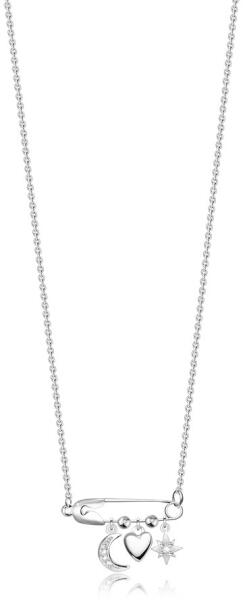 A 925 ezüstből készült nyaklánc apró ovális láncszemekből álló láncból áll, amelyek függőlegesen kapcsolódnak egymáshoz. A medál biztosítótű alakú, amelyen három medál található. Az első félhold alakú, tiszta kerek cirkóniákkal díszített, a második egy sima szív. A harmadik medálon egy nyolcágú kis csillag látható, amelynek közepébe egy tiszta cirkónia v