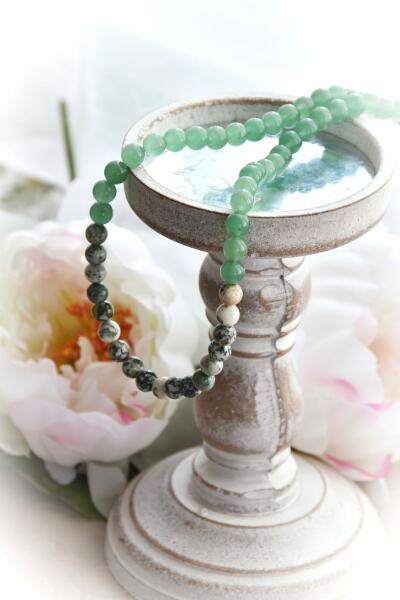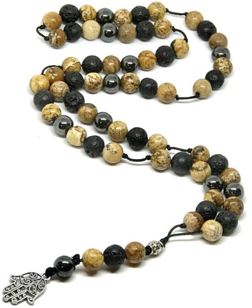 Egyedi ásvány nyaklánc 8 mm-es Jáspis, Hematit és Lávakő ásvány golyókból készült fűzérlánc, Hamsa kéz medállalAmit a Jáspis ásványról tudni kell: Gyakori előfordulása és a földszínek széles skálája miatt a jáspist ősidők óta használják dísztárgyak és pecsétek készítésére. Mágikus ereje miatt is nagyra értékelték. Úgy hitték, hogy túlvilági szell