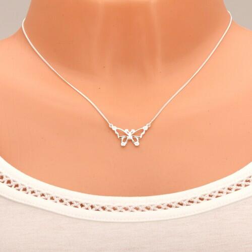 Ezüst nyakék sűrűn összekapcsolt szemekből és pillangókörvonal alakú medálból. A lepke csápjaiba és a szárnyai alsó és felső részébe átlátszó cirkóniák vannak belehelyezve. A szárnyakon található a láncra fűzhető szemecske. A nyakék hossza állítható, delfinkapoccsal záródik. A medál méretei: 21 x 13 mm A nyakék súlya: 2,1 g A lánc szélessége: 1 mm A lán