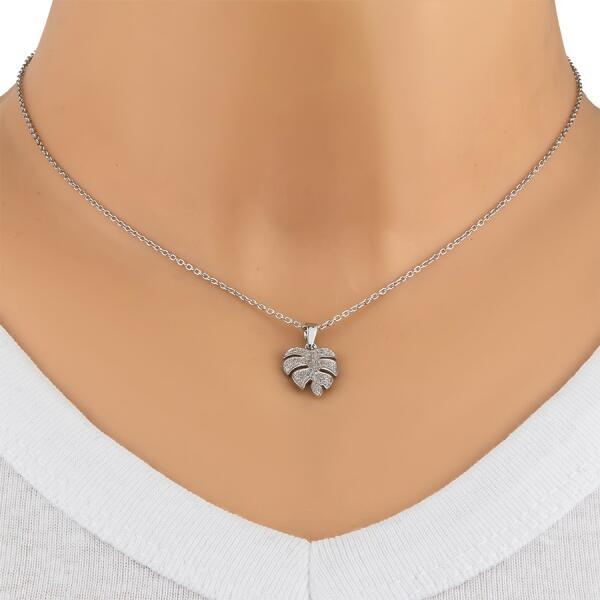 A 925 ezüstből készült nyaklánc kis ovális láncszemekből áll, amelyek egymáshoz kapcsolódnak. A medál "Monstera" levél formájú, kerek átlátszó cirkóniákkal díszítve. A medál egy hosszúkás láncra kerülő szemmel rendelkezik amely felfelé kiszélesedik. A rögzítés rugós gyűrűzárral történik. A nyaklánc platina bevonattal rendelkezik. A medál méretei: 11 x 15 m