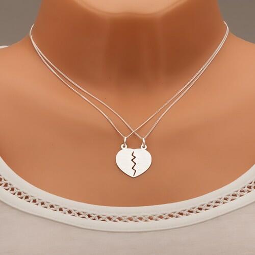 Nyakékek 925 ezüstből állítható hosszal két finom láncból és egy fényes kettős medálból lapos, kettétört szív alakban. A medál közepén egy vékony egyenetlen kivágás húzódik, amely a kettétörést segíti. Mindkét fél szív gravírozott "Best Friends" - "Legjobb barátok" feliratokkal díszített. Delfinkapoccsal záródik. A kettős medál méretei: 22 x 27 mmA medál s