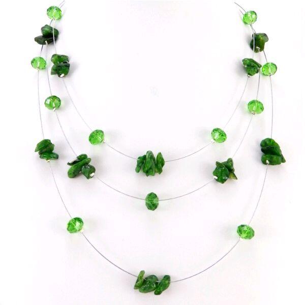 Három soros nyaklánc természetes krómdiopszid drágakövekkel és üveg gyöngyökkel. Anyaga: ékszer sodrony (műanyaggal bevont acél), nikkel és allergiamentes fém részek. Hossza: 43-53cm. A krómdiopszid gyógyhatása