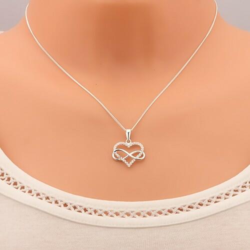 925 ezüst nyakék, vékony lánc és medál. A medál áttetsző cirkóniákkal kirakott szívet ábrázol. A szívet egy fényes végtelen jel fonja át. A nyaklánc hosszabbítható, delfinkapcsos zárszerkezet. Medál mérete: 20 x 18 mmMedál súlya: 2,09 gNyaklánc szélessége: 1 mmNyakék hossza: 400 mmToldólánc hossza: 50 mmTeljes hossz: 450 mm (+/-5%)Súly: 1,41 gFémjelzéssel elláto