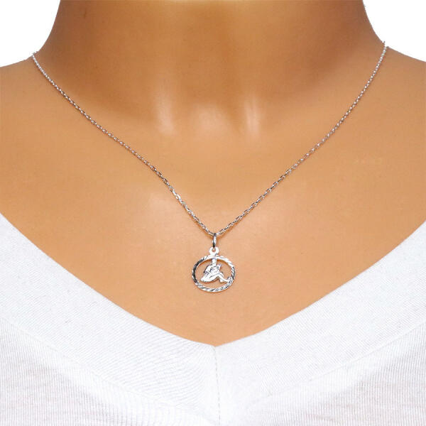 A 925 ezüst nyaklánc vékony ovális láncszemek, enyhén csavart láncolatából áll, amelyeket függőlegesen kapcsolódnak egymásba. A láncot egy medál egészíti ki - lapított kör, ferde rovátkákkal díszítve, középen egy horoszkóp jellel. Gyűrűzárral rendelkezik. Medál átmérője: 14 mm Medál súlya: 0,6 g Láncszélesség: 1,2 mm Lánc hossza: 450 mm Hosszabbító lánc: