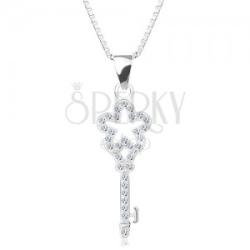 925 ezüst nyakék, amelyet egy vékony lánc alkot szögletes szemekből, valamint egy medál kulcs alakban. A medál felszíne apró cirkóniákkal van kirakva. A kulcs felső része virág körvonal alakú. A nyaklánc hossza állítható, delfinkapoccsal viselhető. Medál mérete: 9 x 24 mmMedál súlya: 1,3 gNyaklánc szélessége: 1 mmNyaklánc hossza: 470 mmHosszabbítható rész: 30 mmNya