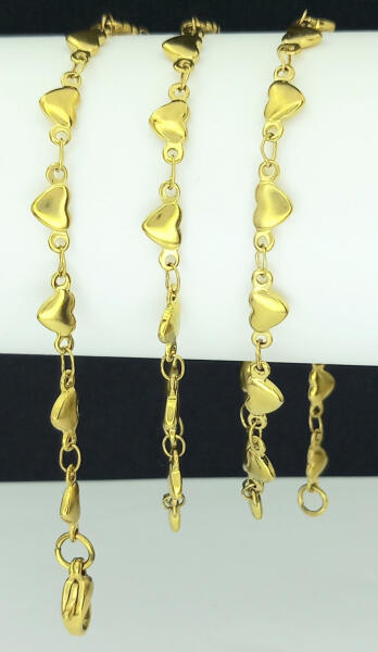 Aranyszínű tömör szív alakú szemekkel díszített nemesacél ( 316L ) nyaklánc. Időtálló ékszer, amit fürdéskor sem kell levenni, bátran viselhető folyamatosan. Antiallergén ékszer. 14K arany színben kapható. Nyaklánc hossza: 50 cm. Nyaklánc szélessége: 4 mm. A nemesacél ékszerek rendkívül népszerűek kedvező tulajdonságaik miatt. A nemesacél semmilyen nikkelsót nem