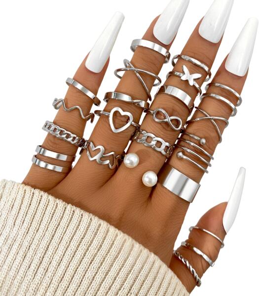 Blake Gyűrűszett Blake gyűrűszett verhetetlen áron. A szettben 22db gyűrű található, 4 - 8 méretben. A gyűrűk különbözőképpen díszítettek (lásd a képet). Tulajdonságok: Anyaga: Fém ötvözet A gyűrűk átmérője: kb. 1,5cm Szín: Ezüst