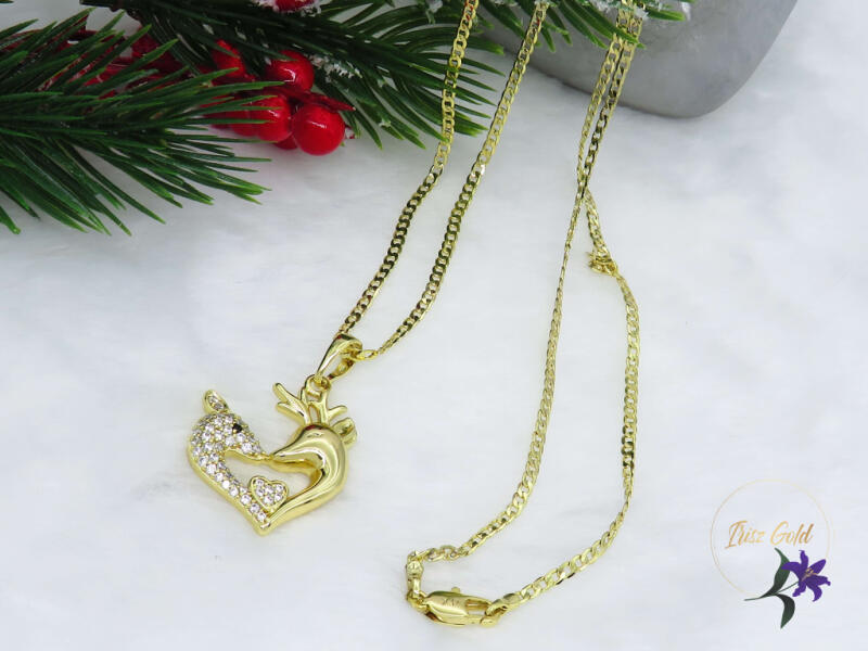 Gold Filled szarvas és gidája medálos nyaklánc Egy szívet alkot a két állatka gida cirkóna kővel díszítve Szin: 14K Méret: 50 cm Medál: 30x20mm A forgalmazott divatékszerek alapanyaga nikkel és ólommentes ezért többnyire nem okoznak allergiás tüneteket, nyugodtan hordhatják fémérzékeny emberek is. Általában nem színezik a bőrt és más divatékszerekhez képest nagyság