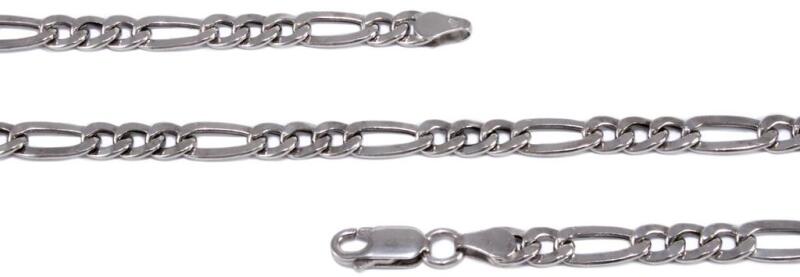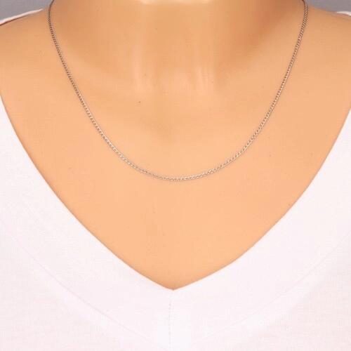 585 fehér arany nyaklánc, egyforma kisebb méretű ovális láncszemekből. A szemek enyhén hajlítottak, kerek kapoccsal rendelkezik . Szélesség: 1,4 mmHossz: 500 mm (+/- 5%)Záró láncszem szélessége: 2 mmSúly: 1,28 gFémjelzéssel ellátott.