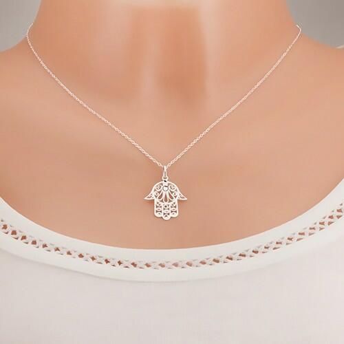 Ezüst nyakék ovális egymásra merőlegesen összekapcsolt szemű nyakláncból és Fatima keze alakú medálból. A kéz díszesen kivágott, miközben a belső vonalak enyhén gravírozottak és a felső részén átlátszó csiszolt kő van beültetve. Rugós karika kapoccsal záródik. A nyaklánc hossza állítható. A medál méretei:20 x 21 mm A medál súlya:0,4 g A lánc szélessége: 1