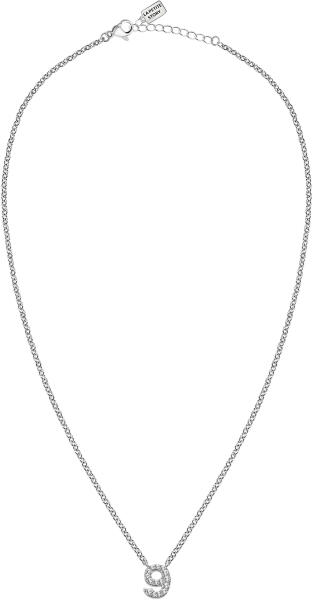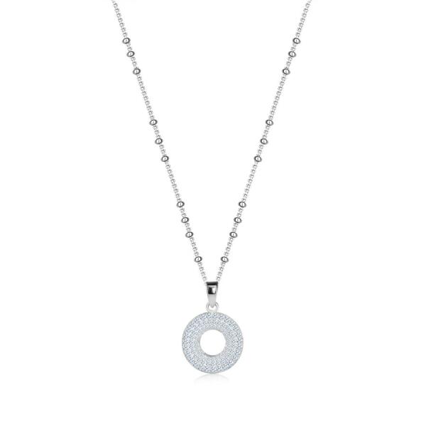 A 925 ezüst nyaklánc platina bevonattal, apró, szögletes láncszemekből álló lánccal, amelyek függőlegesen kapcsolódnak egymáshoz. A vékony láncot apró, sima gyöngyök díszítik. A medál kör alakú, középen kivágással, kerek, átlátszó cirkóniákkal díszítve. A láncra kerülő láncszem ovális alakú és felfelé kiszélesedik. A nyaklánc rugós gyűrűzárral rendel