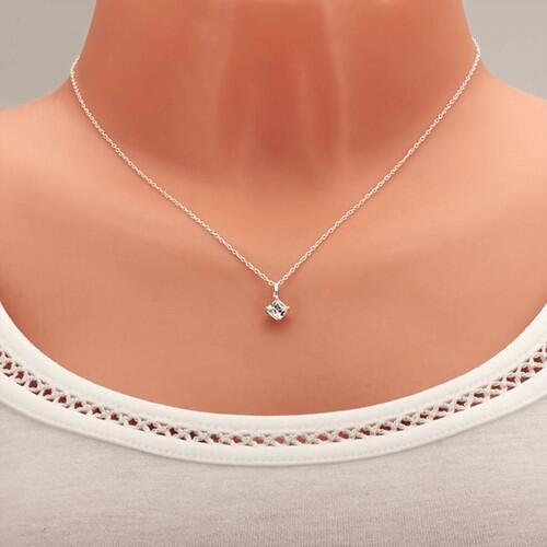 925 ezüst nyakék egymásra merőlegesen elhelyezett ellipszis alakú szemekből álló láncból. A láncon medál függ, melyet átlátszó csiszolt rombusz alakú cirkónia alkot. A kő a magasított foglalatba van belehelyezve és négy karommal megfogva. A nyakék hossza állítható, delfinkapcsolás. A medál méretei: 7,5 x 7,5 mm A medál súlya:0,5 g A lánc szélessége: 1 mm A lánc h
