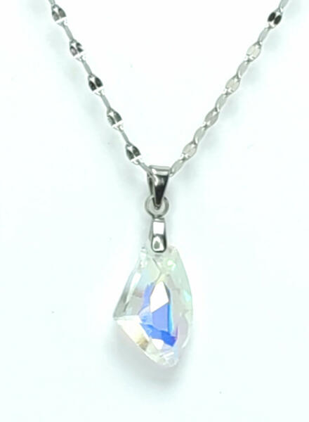 Ezüstszínű nemesacél ( 316L ) nyaklánc, melyet fehér Swarorvski kristályos medál tesz csillogóvá. A kristály világos háttér előtt kékes-fehér, sötét háttér előtt halványsárga színben játszik. Időtálló ékszer, nem feketedik, nem kopik. Mindennapi használatra is tökéletes választás. Antiallergén ékszer. Nyaklánc hossza: 40 cm + 5 cm hosszabbító. Nyaklánc szé
