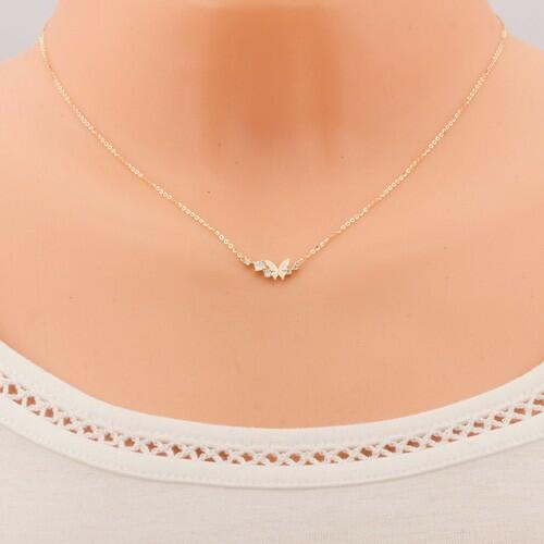 585 sárga arany nyakék vékony nyakláncból, apró pillangós díszítéssel. A pillangó egy cirkóniákkal kirakott, ívelt ágon helyezkedik el. A nyakék hossza állítható, delfinkapocsos a zárszerkezete. Medál mérete: 15 x 6 mmSzélesség: 1 mmHossz: 415 mmHosszabbítható rész: 40 mmTeljes hossz: 455 mm (+/- 5%)Súly: 1,4 gFémjelzéssel ellátott.