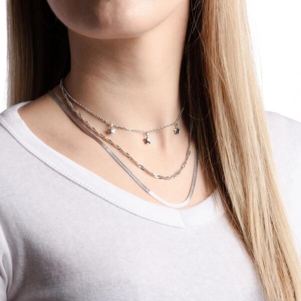 A 925 ezüst nyaklánc az egyik vastagabb kígyóláncból, a másik spirálisan csavart láncból, sűrűn összefüggő ovális láncszemekből áll. A harmadik lánc ferde hosszúkás láncszemekből áll, amelyek függőlegesen kapcsolódnak egymáshoz. A láncon három, ötágú csillag alakú medál található. A nyaklánc állítható hosszúságú és homárkaromzárral rögzíthető. Csi
