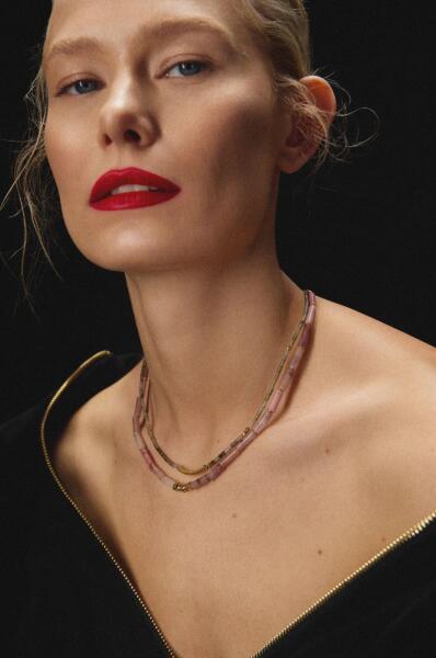 Hosszú nyaklánc 585 sárga aranyból, amely függőlegesen összekötött ovális láncszemekkel és egy díszítő részből áll. A díszítő részt szilárdan rögzített, sima oválisra vágott cirkóniák képviselik, amelyek felváltva elhelyezett világos, olívazöld, mentazöld, ametiszt, világos rózsaszín és pezsgő színűek. A nyaklánc állítható hosszúságú, rugós gyűrű