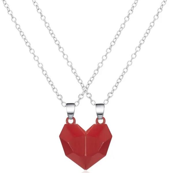 Magnet Heart Nyakékek Modern Magnet Heart nyakék verhetetlen áron. A csomagolás 2db nyakéket tartalmaz, így az egyiket elajándékozhatja kedvesének. A medálok a mágnesnek köszönhetően egy szívecskévé csatlakoztathatók. Tulajdonságok: A nyakláncok hossza: 52cm A szívecske medál mérete: összekapcsolva 1,8cm, egy fél 1,8cm x 0,8cm Anyaga: Fém ötvözet Szín: Piros