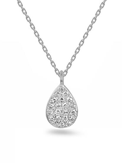 Ez a gyönyörű, fehéraranyból készült, briliáns csiszolású gyémánt nyaklánc az eleganciát és a precíz ékszerkészítést ötvözi. A design alapeleme a csepp alakú dísz, amely teljes egészében briliáns csiszolású gyémántokkal van kirakva, amelyek összsúlya 0,060 ct. A H színű és SI1 tisztaságú gyémántok káprázatos ragyogást kölcsönöznek a nyakláncnak, amely