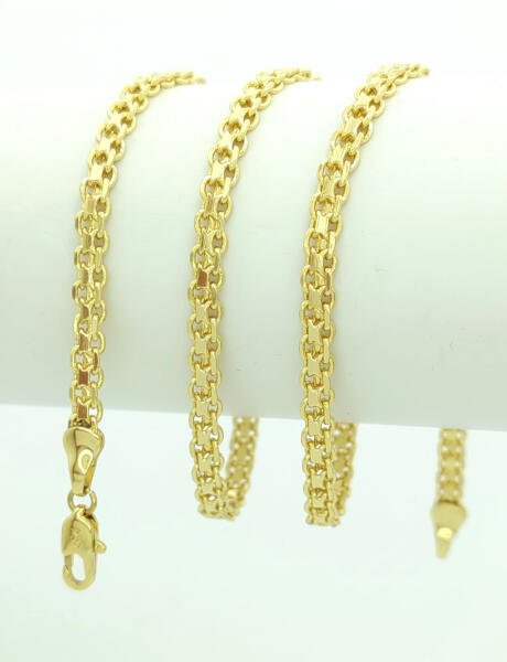 Aranysárga színű lapos nyaklánc. Időtálló ékszer, nem feketedik víz hatására sem. Antiallergén ékszer. 14K arany színben kapható. Nyaklánc hossza: 45 cm. Nyaklánc szélessége: 3,5 mm. Az antiallergén ékszerek olyan fémötvözetből készülnek, melyek nem irritálják a bőrt, nem okoznak allergiás reakciókat, ezért fémre érzékeny hölgyek, urak is bátran viselhetik. Az