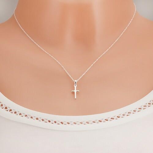 Ezüst nyaklánc fényes felülettel, amelyet egymásra merőlegesen forrasztott ovális szemekből álló lánc és latin kereszt medál alkot. A kereszt sima vonalakból áll, a tetején karikával. A lánc körkapoccsal készült. A medál méretei: 8 x 14 mmA medál súlya: 0,4 gA lánc szélessége: 1,1 mmA lánc hossza: 400 mmA toldólánc hossza: 50 mmA lánc teljes hossza: 450 mm (+/- 5%)A