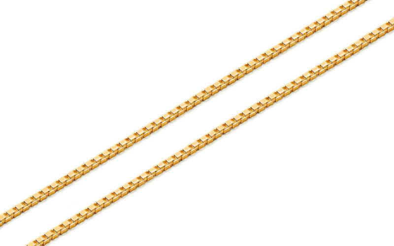 Elegáns kocka mintás lánc, más néven kocka minta, sárga aranyból. Az ínszalagos és finom lánc kis négyzet alakú szemekből áll.