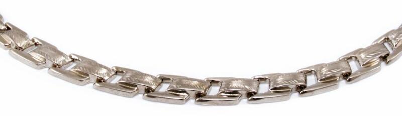 Modern stílusú, igen kedvelt fazonú, ródiummal, véséssel és mattítással ékített, középre szélesedő üreges szemekből készült stiftes ezüst nyakék.