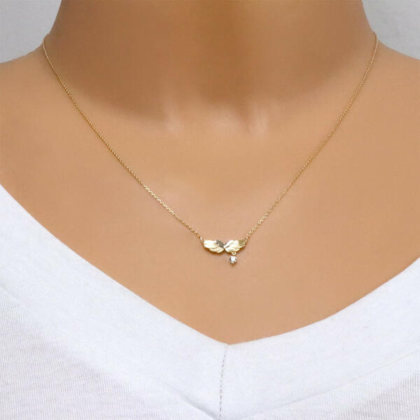 A 375 kombinált arany nyakláncot egy angyalszárny alakú medál díszíti, amely alatt egy kerek átlátszó cirkónia függ. A szárnyak széle kissé ívelt. A szárnyak felületét tollakat formázó bemetszések alkotják. A szárnyak közepét fehér arany díszíti. A láncot egymással összekapcsolt, apró ovális láncszemek alkotják. Állítható hosszúság. Rugós karika zárszerke