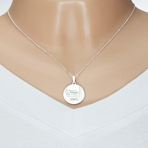 A 925 ezüst nyakék sűrűn összekapcsolt ellipszis alakú szemekből álló láncból és medálból tevődik össze. A medál kerek, lapos tábla, amelyet gravírozott szöveg díszít "Shoot for the moon. Even if you miss, you´ll land among the stars" - "Menj a hold felé. Ha el is véted a csillagok között leszel". Az idézetet hold és három csillag alakja egészíti ki. A medál háts