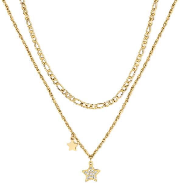 Moonstar nyakék Nyakék, amely megörökíti az éjszakai égbolt varázsát! Finom arany lánc elbűvölő hold, csillag és gyöngy medálokkal, amely eleganciát és misztikus hangulatot kölcsönöz. Ideális kiegészítő olyan hölgyeknek, akik szeretik a szépség és a szimbolika összekapcsolódását. Tulajdonságok: Összetétel: Nemesacél Szín: Arany