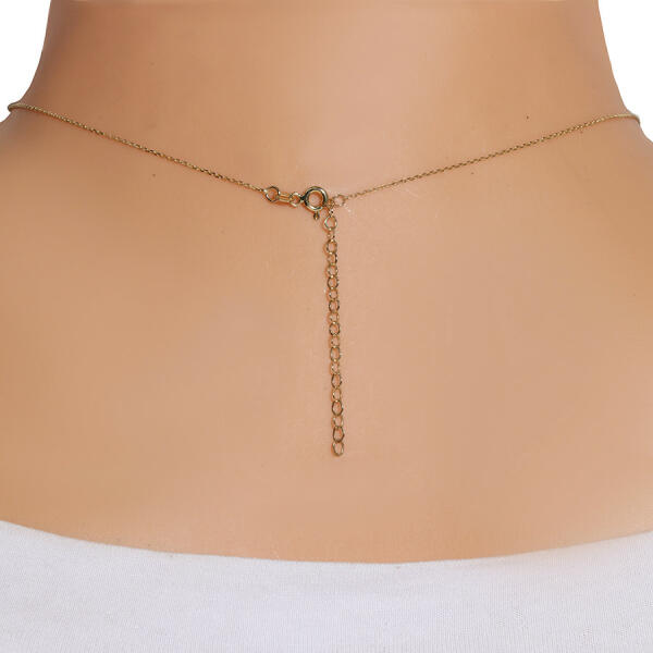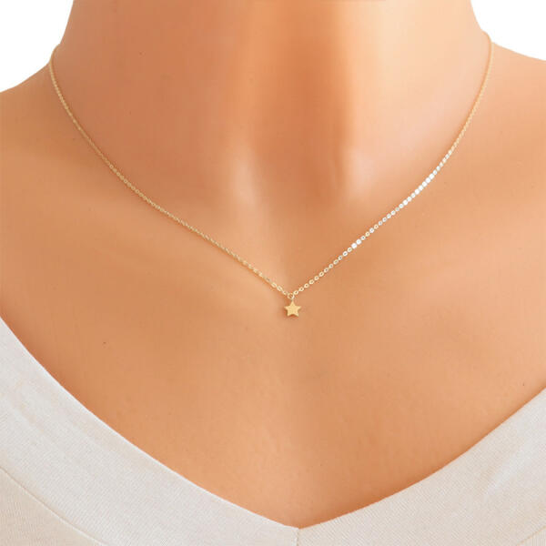 A 9K sárga arany nyaklánc egy fényes, finom, lapos láncszemekből álló lánc, amelyre egy szimmetrikus, ötágú, fényes és sima felületű szimmetrikus csillag formájú medál van erősítve. A nyaklánc állítható hosszúságú és rugós gyűrű zárral rendelkezik. A medál mérete: 4,5 x 5,5 mm A láncszemek szélessége: 1 mm A nyaklánc hossza: 450 mm Lánchosszabbítás hossza: