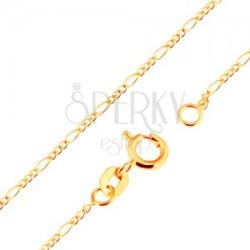 A 18K sárga arany nyaklánc Figaro mintából - három ovális, egyenletes szemből és egy hosszúkás, lapos felületű elemből tevődik össze. A nyaklánc felülete sima és tükörfényes. Delfinkapcsos zárszerkezet. Nyaklánc szélessége: 1,3 mmNyaklánc hossza: 500 mm (+/- 5 %)Zárószem átmérője: 4 mmNyaklánc súlya: 2,5 gFémjelzéssel ellátott.