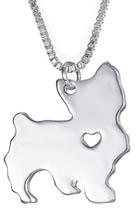 Egy rövidre nyírt, cuki yorkshire terrier kutyust ábrázol ez a fémes csillogású medál, közepén egy kivágott szívvel.