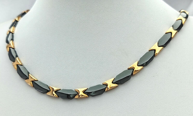 Rose gold színű nemesacél (316L) nyakék, fekete kerámia betétekkel. A nemesacél előnyös tulajdonságainak ( nem kopik, nem feketedik, nem okoz allergiát ) és a kerámia szépségének ötvözése ez a mutatós nyakék. A kerámia anyagában színezett, tartós, nem törik. A nyakék hátuljában mágnesek találhatóak (élettani hatása közismert). Prémium minőségű, antiallergén