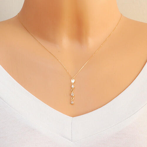 A 14K sárga arany nyakláncot egy medál díszíti, amely három átlátszó színű cirkónia cseppből áll. A cseppek kerek fényes gyűrűkkel vannak egymással összekapcsolva. A láncot egymással összekapcsolt, apró ovális láncszemek alkotják. A nyaklánc hossza állítható. Rugós karika zárszerkezettel. A medál mérete: 4 x 33 mmA lánc szélessége: 0,6 mmA nyaklánc hossza: 390