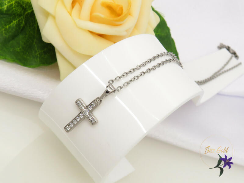 Antiallergén kereszt medálos nyaklánc . Kis kereszt cirkóna kővel díszítve Szin: rodium( ezüst) Méret: 49cm/2mm Medál: 20x10mm A forgalmazott divatékszerek alapanyaga nikkel és ólommentes ezért többnyire nem okoznak allergiás tüneteket, nyugodtan hordhatják fémérzékeny emberek is. Általában nem színezik a bőrt és más divatékszerekhez képest nagyságrendekkel jobb kopá