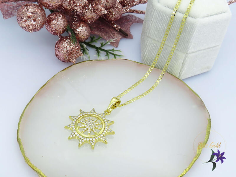 Gold Filled nap medálos nyaklánc . Medált apró cirkóna kövek díszítik Szin: 14K Méret: 50 cm Medál: 32x24mm A forgalmazott divatékszerek alapanyaga nikkel és ólommentes ezért többnyire nem okoznak allergiás tüneteket, nyugodtan hordhatják fémérzékeny emberek is. Általában nem színezik a bőrt és más divatékszerekhez képest nagyságrendekkel jobb kopásállósággal rend