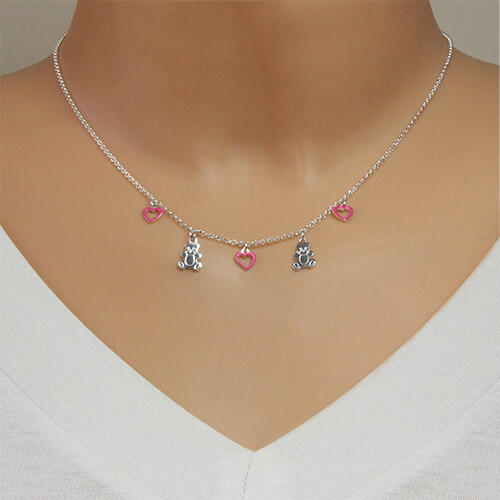 A 925 ezüst gyerek nyakláncot három rózsaszín fénymázzal és a közepén dekoratív kivágással ellátott szív, valamint két fényes maci díszíti. A macik testét vonalak díszítik, amelyek a szemét, a száját, a hasát és a mancsait alkotják. A lánc kerek szemekből áll, amelyek egymásra merőlegesen vannak összekapcsolva. Nyaklánc delfinkapoccsal. A maci mérete: 7 x 11 mmA
