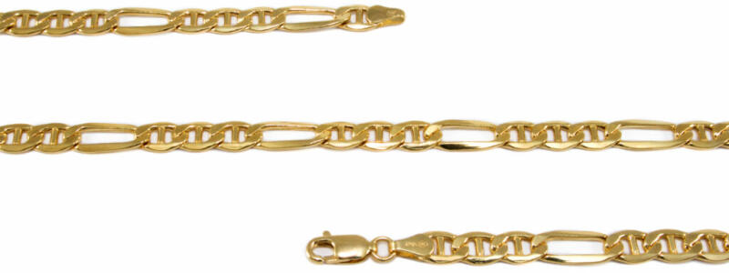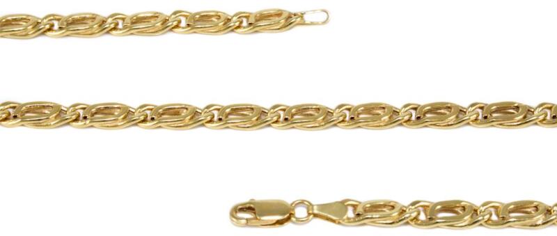 Kedvelt fazonú, pálcás betétekkel kombinált, 3+1 szemkötésű, üreges, de masszív kialakítású, "H-figaró" típusú aranylánc.
