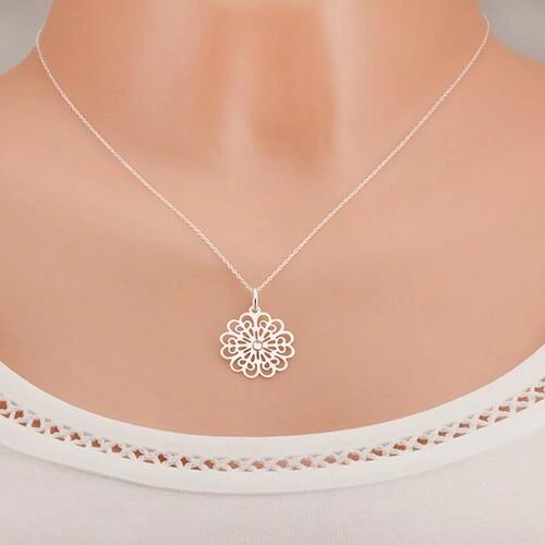 Nyakék 925 ezüstből ovális egymásra merőlegesen összekapcsolt szemű láncból és lapos medálból. A medál virág alakú és a felszíne ív és könnycsepp alakú kivágásokkal díszített. A virág közepében egy kerek átlátszó cirkónia van elhelyezve. Kerek kapoccsal rendelkezik . A medál méretei: 20 x 20 mm A medál súlya: 0,58 g A lánc szélessége: 0,9 mm A lánc hossza: