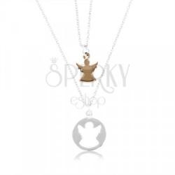 A 925 ezüst nyakláncokat két különböző hosszúságú, ovális szemekből álló lánc és két medál alkotja. Az egyik medál ezüst színű és kerek alakú, angyal formájú kivágással. A másik medál réz színű és angyal formájú, amely pontosan beleillik a körön lévő kivágásba. A nyakláncok delfinkapoccsal záródnak. Kör tábla átmérője: 13 mmAngyal méretei: 8 x 9 m