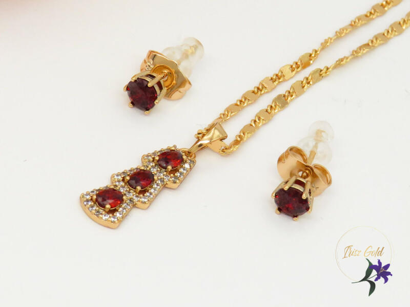 Antiallergén szett nyaklánc fülbevaló. Gyönyörű három piros CZ kőből álló medál szép metszett nyakláncon, fülbevaló hozzá illő piros szegfű fülbevaló Szin: 18K Méret: 50cm/2mm Medál: 25x7mm Fülbevaló 5x5mm Bedugós A forgalmazott divatékszerek alapanyaga nikkel és ólommentes ezért többnyire nem okoznak allergiás tüneteket, nyugodtan hordhatják fémérzékeny ember