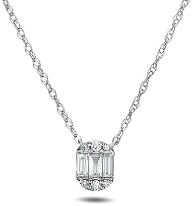 A 0,585 tisztaságú fehér aranyból készült nyaklánc a modern és időtlen design gyönyörű példája. Finom és minimalista stílusa miatt ez az ékszer nagyszerű kiegészítő a mindennapi viselethez és különleges alkalmakhoz. Az ékszert kerek briliáns és természetes baguette alakú gyémántok díszítik, amelyek összsúlya eléri a 0,1400 ct-ot. A kiváló minőségű, H szín