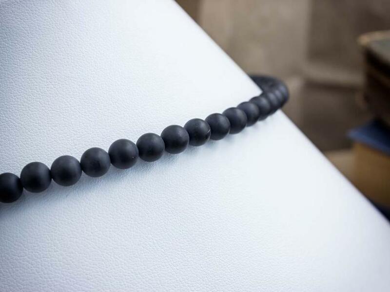 6 mm-es mattított ónix ásványgyöngyökből készült nyaklánc. Amit az ónixról érdemes tudnod: Az ónix általában fekete, néha előfordulhat fehér, szürkés csíkozódással is. Lelki gyógyhatása: Az ónix egy védelmező kő, amely a negatív energiák ellen véd. Csökkenti a befolyásolhatóságunkat, növelve így az önbizalmunkat, egészséges egónkat. Egyensúlyba hozza a k